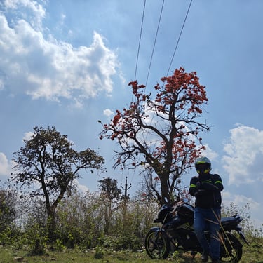 After covering a good stretch on the highway, we took a turn into rural roads—and that’s where things started getting interesting. The terrain became rough, roads narrower, and the surroundings more raw and natural. We were no longer just travelling; we were exploring. Riding through village paths, patches of broken roads, and off-road sections gave us that true adventure feel. At one point, we rode through fields glowing with bright orange Palash flowers, creating a surreal landscape. We stopped there for a while—not just for photos, but to actually absorb the beauty around us.